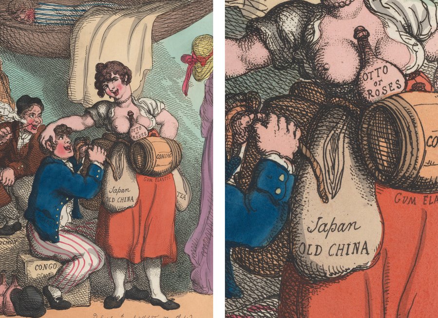 3. Томас Роулендсон. «Подготовка контрабандиста», 1810. 4. Джайлз Гринагейн. Карикатура «Погрузка контрабандистки», 1804.