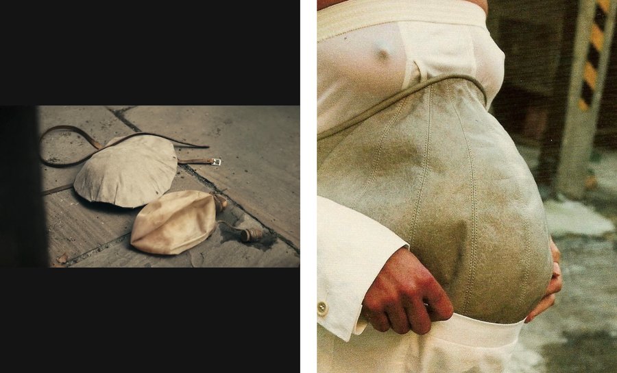 69. Кэрол Кристиан Поэль. «Беременная сумка», 2002. Реализация в современной моде того же принципа, использования потенциально-допустимого феминного объема тела для хранения.