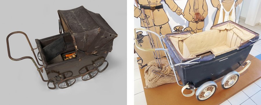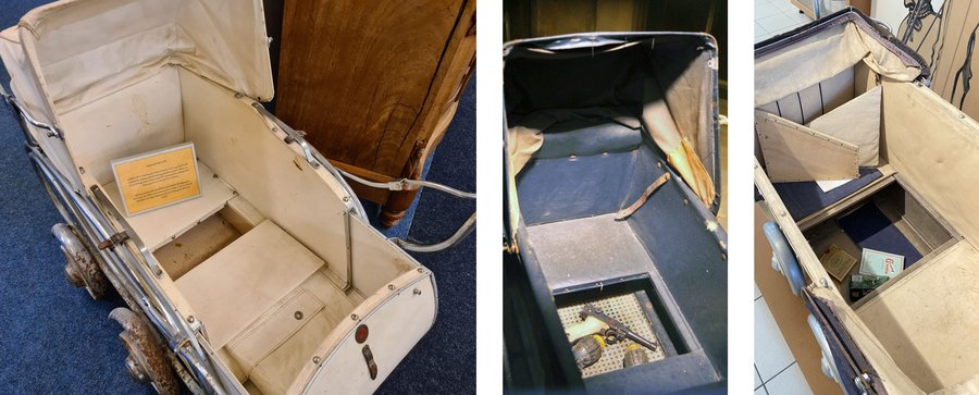 72. Детская коляска, использовавшаяся для контрабанды, 1940-е. Эта коляска времён Сопротивления имеет двойное дно, которое можно было использовать для контрабанды запрещённых товаров. 73. Коляска для контрабанды, 1940-е. Коллекция была создана как тайное место для контрабанды алкоголя из Франции в Бельгию. На обратном пути из Бельгии во Францию перевозились кофе, табак, шоколад и другие товары. 74. Коляска с двойным дном для контрабанды оружия, 1940-е. 75. Коляска для контрабанды, 1940-е. Коллекция была создана как тайное место для контрабанды алкоголя из Франции в Бельгию. На обратном пути из Бельгии во Францию перевозились кофе, табак, шоколад и другие товары. 76. Чарльз Брейер. Фотография «Перевозка оружия в детской коляске. Бен Стенкамп кладёт базуку в коляску, Амстердам», ок. 1945. 77. Чарльз Брейер. Фотография «Перевозка базуки в детской коляске: Бен Стенкамп кладёт базуку в коляску, его жена кладёт ребёнка сверху», ок. 1945.