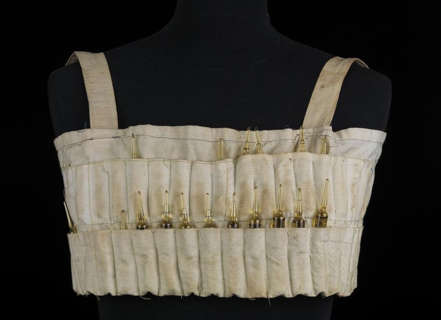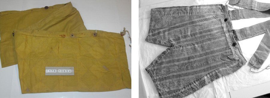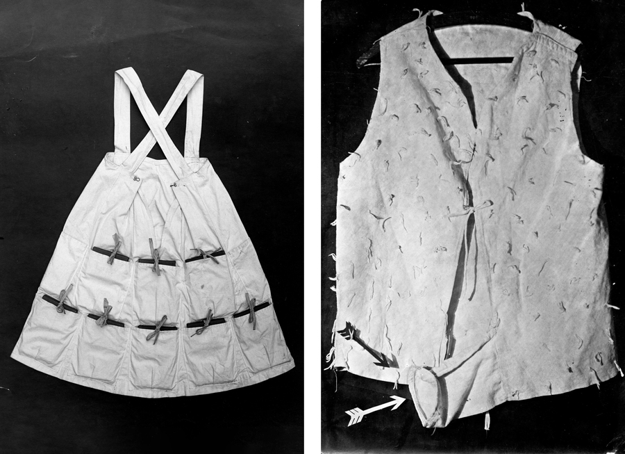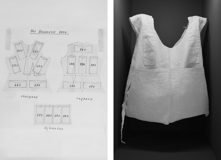 1. Фартук для контрабанды товаров, 1922 год. 2. Жилет, который контрабандисты использовали в Лимбурге для перевозки фасоли. Он был заполнен в местах, указанных стрелками на фотографии. Нидерланды, 1917 год. 3. Якоба ван Тонгерен. Перевозка продуктовых талонов по стране была задачей, которую Якоба выполняла регулярно. Она разработала для этого специальный жилет; выкройка сохранилась до сих пор. Она носила его под одеждой, и когда он был наполнен талонами, она выглядела просто как беременная или, скорее, крупная женщина. Эти перевозки талонов принесли ей прозвище «Королева талонов». Было лишь несколько эскизов жилета, о чем свидетельствует альбом Якобы «Het bonnenvest» (Жилет с купонами), рисунок, который Якоба сделала по памяти после войны, когда начала записывать свои воспоминания. 4. Жилет контрабандиста, Между XIX и началом XX веков, Мускрон. Жилет без рукавов с двумя большими карманами спереди. Завязки по бокам позволяют регулировать его по фигуре под одеждой.