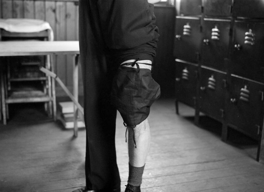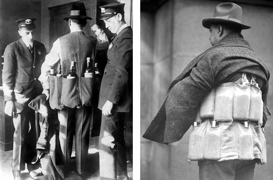 2. «Сухой закон, контрабанда, Детройт», 1920-е годы. «Изобретательный анонимный человек демонстрирует репортерам, как можно перевозить фляжки с алкоголем по городу во время сухого закона».