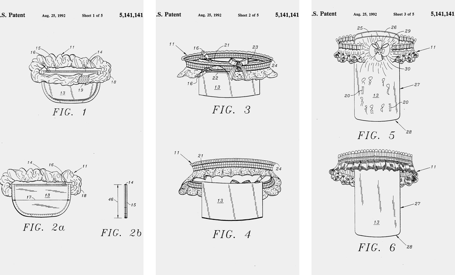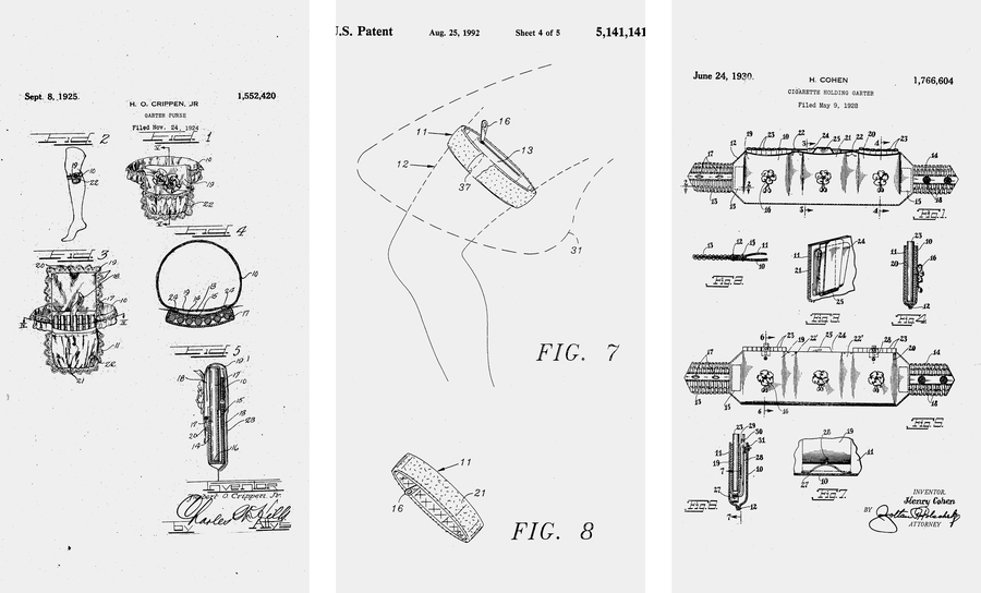 Сильвия Бомбардини. Две версии интерпретационной копии изобретения Хамбургер: одна с эластичными элементами, а другая — с веревочкой». Хамбургер, Мэри Дж., 1913. Подвязка с карманом. US1070250