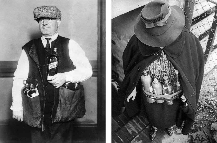 1. «Контрабанда спиртного: Двое полицейских задержали мужчину, пытавшегося пронести несколько бутылок спиртного в карманы жилета под пальто. США», 1922 год.