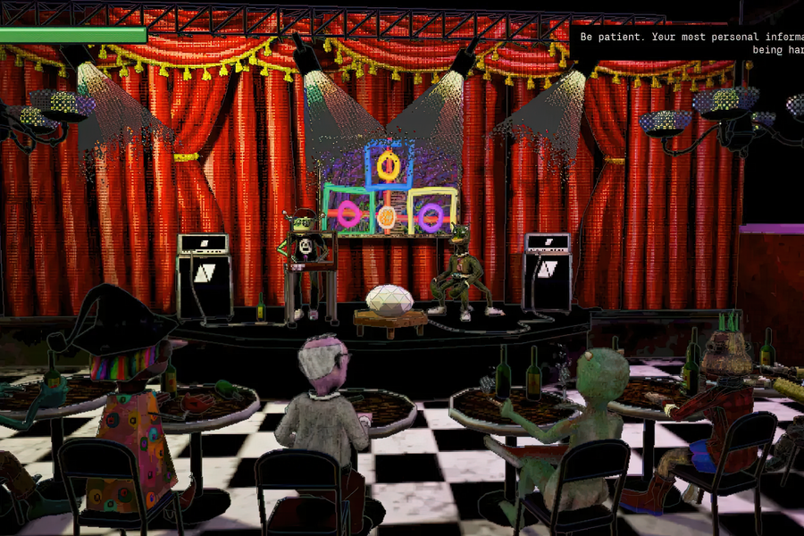Пространство затемнено и локализовано — игроки входят в игровую комнату, где терминал выглядит одновременно как пульт управления и как ритуальная трибуна. Аппарат остаётся видимым: контроллеры, кабели, инсталляционные панели не скрыты, что подчёркивает процедурную природу медиума; публика чувствует институциональный вес происходящего — не только потому, что игра представлена в музее, но и потому, что музей становится площадкой для коллективного пересмотра правил мира.