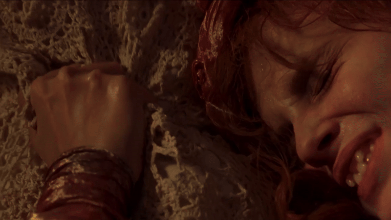 Так, Люси будто бы пожинает плоды своего порочного поведения, оказываясь зараженной вампиризмом. Концепт Мадонны и Блудницы в отношении ее и Мины, главной героини, подчеркивается во второй представленной выше сцене. Там мы видим кадры свадьбы Мины с Джонатоном, проходящей в православной церкви, которые смонтированы параллельным монтажом с кадрами стонов и страданий Люси, и того, как та хватается за простыню.