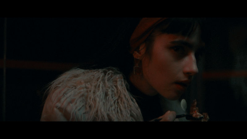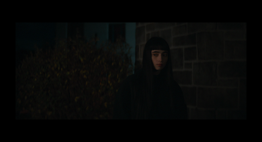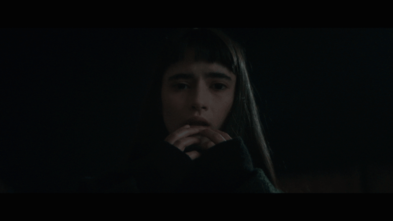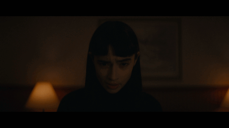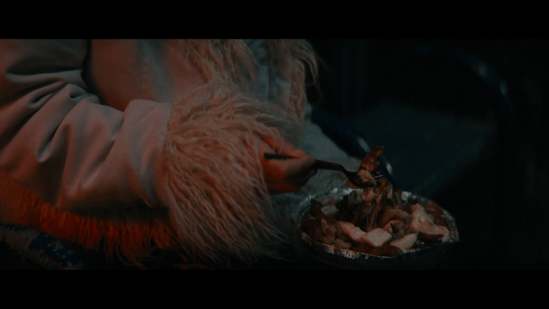 Несмотря на свое физическое отторжение от вампиризма, Саша предпринимает попытки соответствовать своей идентичности. На представленном выше кадре мы видим, как девушка робко тянется к окровавленному крюку. Однако Саша отдергивает руку на полпути, демонстрируя неготовность к кровожадному образу жизни. Тут камера сфокусирована на крюке, оставляя девушку в размытии, подчеркивая ее фокус на попытках вписаться, требующих от нее предательства своей натуры.