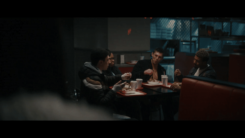 Желание Саши жить как обычный человек достигает кульминации, когда та покупает картошку, такую же, как ели подростки в предыдущих кадрах, и решается ее попробовать. Есть человеческую еду для Саши смертельно опасно, поэтому вилку она поднимает робко и медленно, пытаясь решиться на радикальный поступок. Эта сцена показана на крупном плане, делая человеческую еду — запретный плод для Саши — центром композиции. В момент, когда Саша уже подносит вилку ко рту, остановка, на которой девушка сидит, начинает мигать. Мигание света в данном фильме зачастую демонстрирует эмоциональное состояние вампира. Мигает постер с социальной рекламой с телефонным номером доверия для людей, задумывающихся о суициде. Это одновременно оказывается как комментарием на попытку девушки причинить себе вред ради того, чтобы вписаться, так и неожиданным решением ее проблемы.