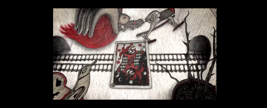 Фильм Режины Песоа «Кали, маленький вампир» рассказывает историю инаковости, тоски и невозможности влиться в общество. Маленький вампир Кали каждый день прячется в тени, наблюдая за тем, как играют в мячик другие дети. Будучи вампиром, он не может выйти на солнце и присоединиться к ним, да и его нечеловеческий внешний вид ребят только напугает. Жаждя принятия и общения, мальчик делает вид, что тоже играет в мячик, находясь при этом в тени за забором. Красный цвет мяча, противопоставленный черно-белым тонам фильма делает его центральным для данного кадра, увеличивая важность этой игры.