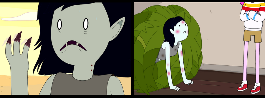 Схожие проблемы с солнечным светом испытывает и Марселин, героиня мультсериала «Время Приключений». В представленной выше мизансцене мы видим девушку, сидящую в обширной пустыне под тенью маленького дерева. Зонтик, необходимый ей, чтобы выйти на свет, укатился, из-за чего ей приходится высунуть руку за пределы тени. Тут же на крупном плане нам показывают как рука девушки покрывается ожогами, едва соприкоснувшись с солнечным светом. Пальцы героини оказываются обуглены, из-за чего той приходится вернуться домой внутри кроны дерева. Эта сцена обыграна комично, однако она хорошо иллюстрирует уязвимость, которой вампиризм наделяет многих героев, лишая их возможности жить «нормальной» жизнью.