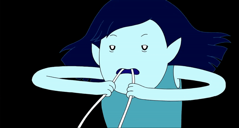 Для героини мультсериала «Время приключений» Марселин вампиризм и избавление от него тоже становятся моральным выбором. Ее терзания оказываются изображены в ночном кошмаре. Мы видим, как клыки Марселин удлиняются, и против ее воли через них начинает поступать кровь. Камера отдаляется и оказывается, что клыки воткнуты в анатомически правильное сердце, что показывает зависимость жизни девушки от вампиризма. Сердце трансформируется в корову, существо, являющееся в сериале частой жертвой вампиров. От ужаса от возможной причастности к насилию, героиня вырывает клыки из своего рта, после чего ее тело распадается на части. В этом отражены не только ее моральные терзания, но также связь идентичности и стиля жизни героини с ее вампирской сущностью, потеря которой может означать для нее потерю самой себя.