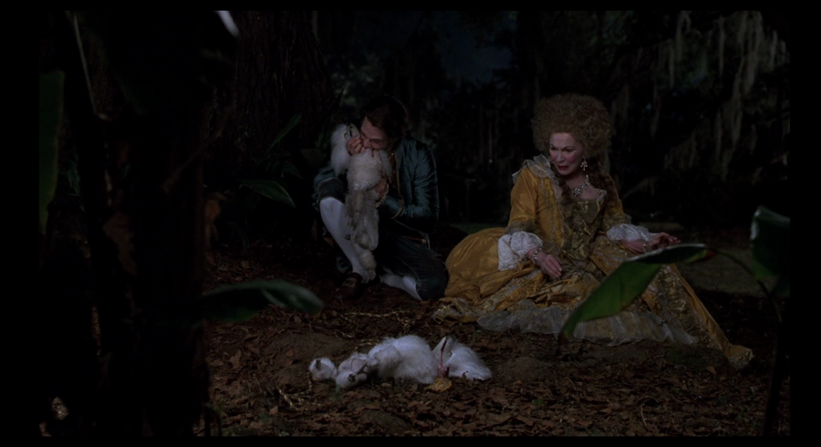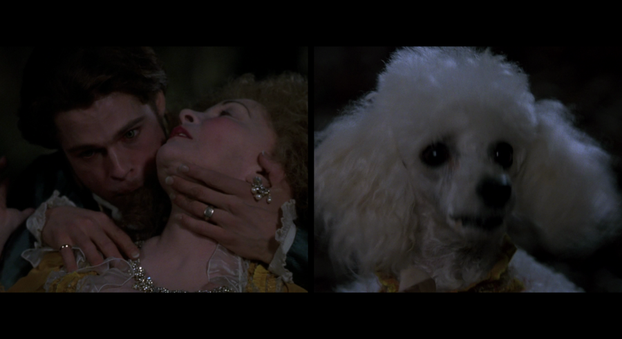 Предпринимая попытки пить человеческую кровь, Луи сталкивается с отторжением от этого процесса. На приведенных выше кадрах герой соблазняет аристократку в попытке насытиться ей, однако взгляд ее маленьких собачек не дает ему закончить: он испытывает слишком сильные угрызения совести. Мы видим крупные кадры собачьих морд, что показывает то, как Луи фокусируется на этой детали. В итоге вампиру приходится выпить кровь маленьких собачек, не осмелившись убить женщину. Поедание мужчиной собак выглядит жалко.