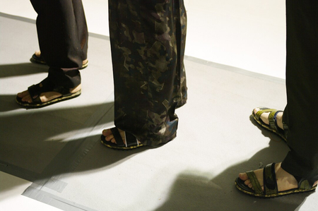 Приглашения в виде металического жетона Весенне-летняя мужская коллекция содержала много камуфляжных принтов на брюках, куртсках и сандалях. Пришлашения были сделаны в виде штампованной медной пластины с датой, местом и временем. Оно напоминало жетоны военнослужащих, которые они носят для идентификации личности