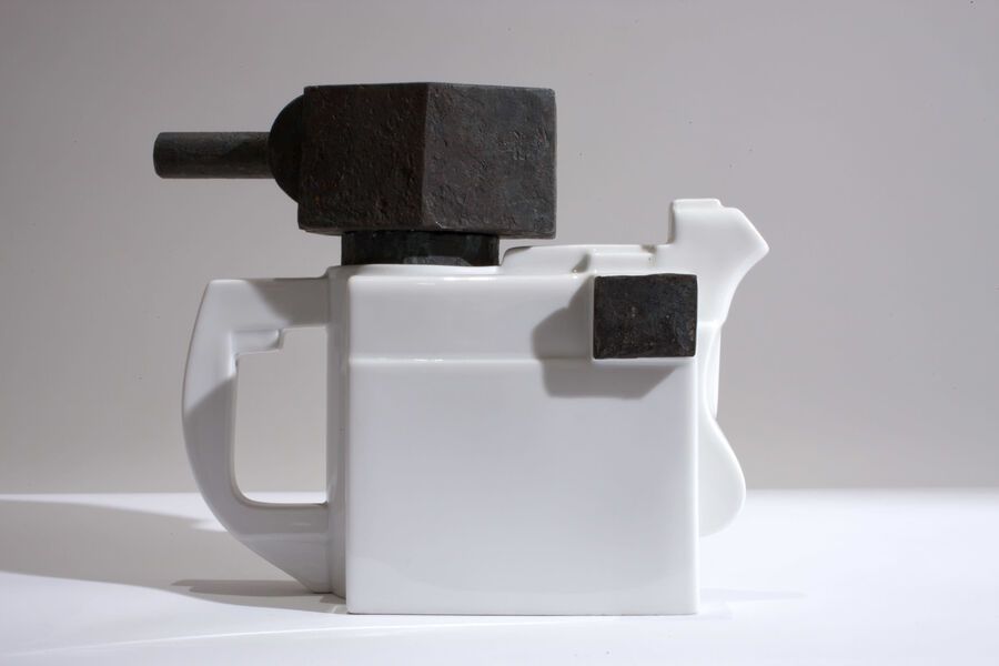 Леонид Соков в своих работах часто обращается к мировому культурному наследию, иронично выстраивая свои художественные высказывания. Так в его работе «Твердный знак» художник буквально материализует твердный знак из металла, который становится созвучен по силуэту с другой работой художника. На заднем плане расположена панель с силуэтом фарфорого чайника под названием «Куда девалась агрессия русского авангарда?», который был создан ранее.