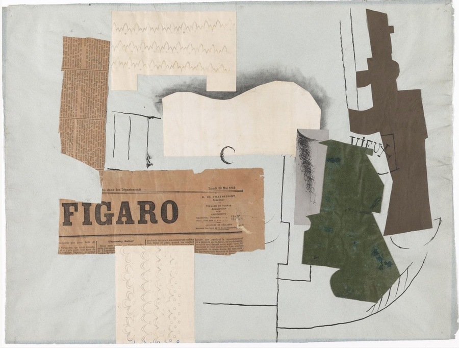 Коллаж Пабло Пикассо «Бутылка старой водки, стакан, гитара и газета», 1913 и вырезка из газеты 1883 года