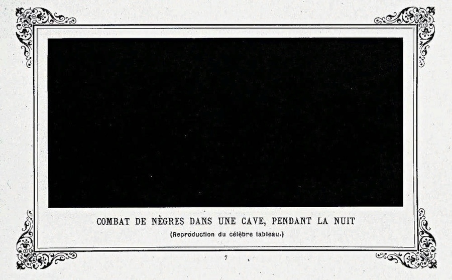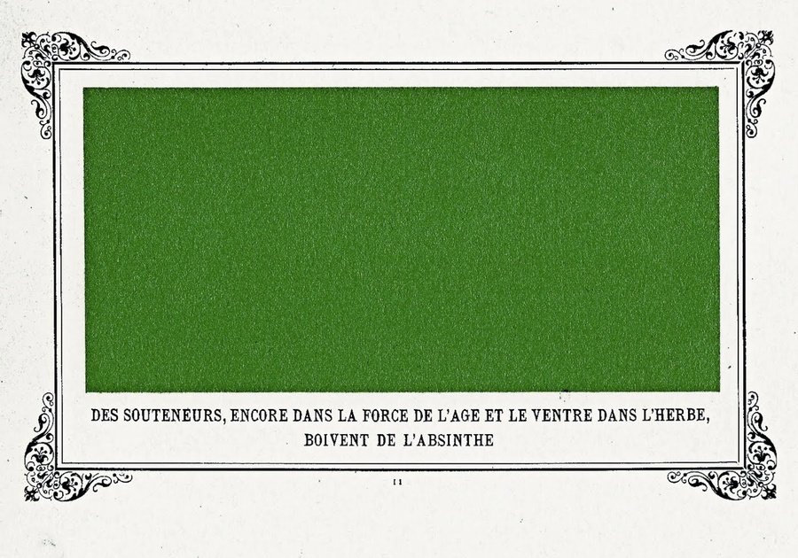 Так на черной карикатуре зритель должен разглядеть «Битву негров в пещере глубокой ночью», а на зеленой — «Сутенёров в расцвете сил, пьющих абсент, лежащих на животах в траве». Эпатажные подписи расширяли понимание изображения.
