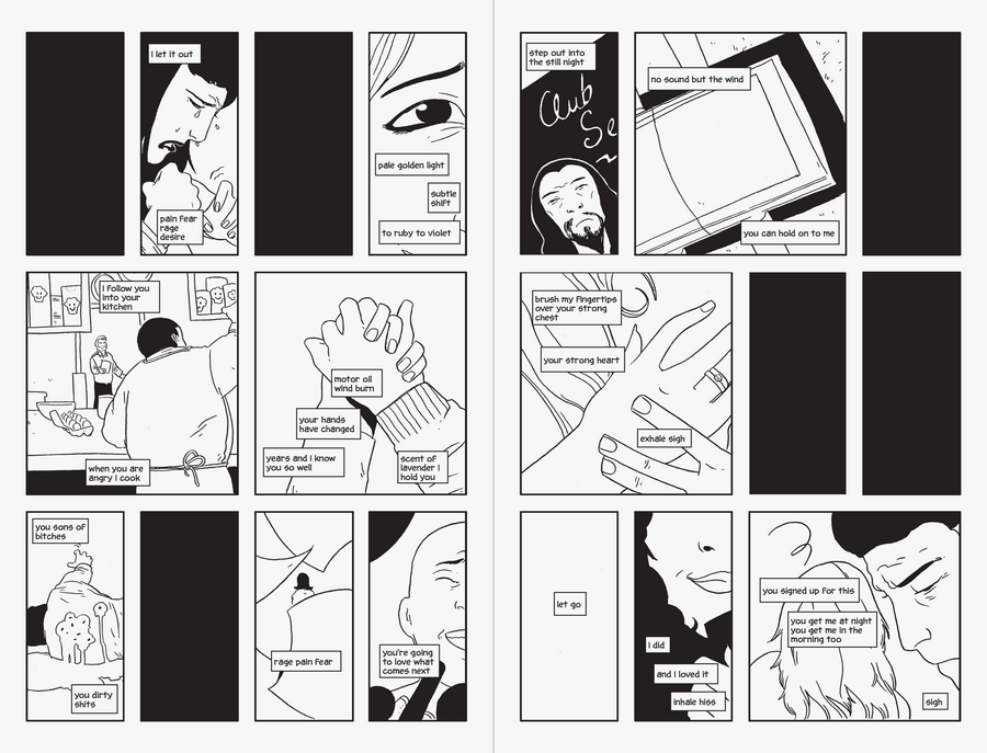 Однако в основном мы видим попарно соединенные фреймы. В каждом из них довольно простая история любви. Мы видели их в кино, читали в книгах, а может быть даже и переживали сами. Идея Рэя Фоукса заключается в другом: все они существуют одномоментно и, средствами комикса он показывает это точно и ёмко. У каждой истории — своя линия, свой характер и даже своя длительность. Расположенные рядом в рамках одного разворота, они демонстрируют уменьшенную модель мира, в которой судьбы некоторых людей пересекаются и оказывают взаимное влияние, а других — существуют параллельно, если и вовсе не протекают в вакууме.