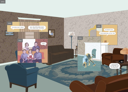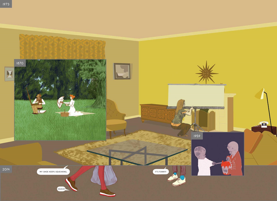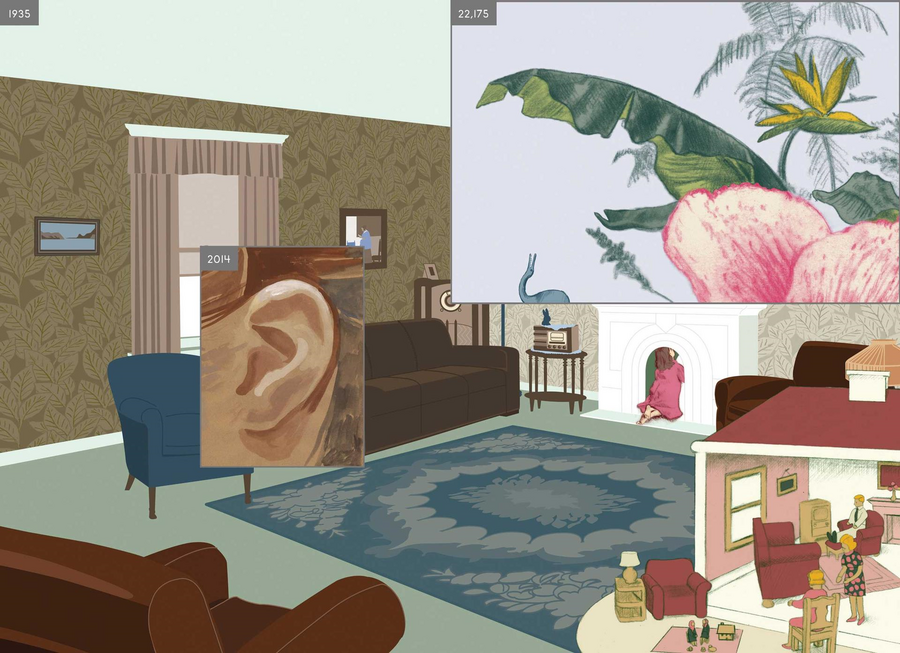 Однако большую часть книги занимают кадры периода XX и XXI веков, когда на этом месте был построен дом. Разворот за разворотом, зритель видит один и тот же угол гостиной, в которой за десятки лет сменяется несколько поколений жильцов, изменяется интерьер и его детали.