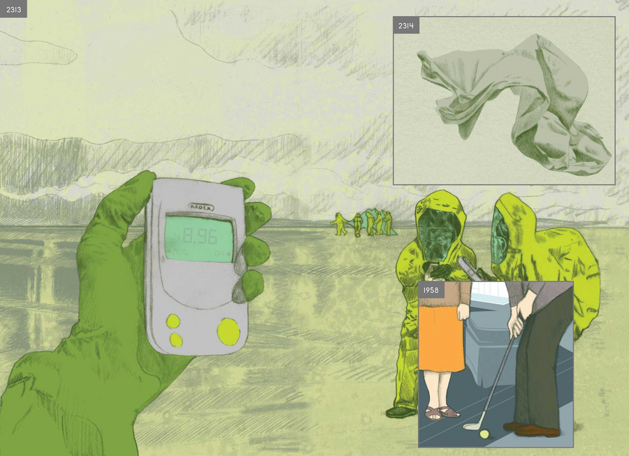 Завершить раздел хотелось бы работой Ричарда Макгуайра. Комикс «Здесь» был нарисован в 1989 году для журнала «Raw» и состоял из 6 полос. Он рассказывает историю семьи, используя один и тот же ракурс на угол гостиной на протяжении 36 кадров. На самом же деле комикс рассказывает историю места, которое менялось на протяжении тысячелетий и еще будет меняться в будущем. То есть, этот комикс о времени. О ценности настоящего момента, который неизбежно ускользнет и сменится другим.