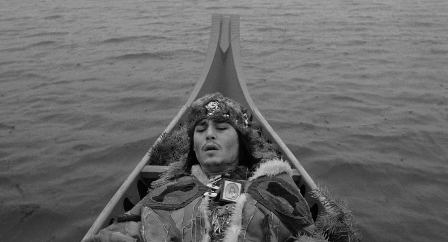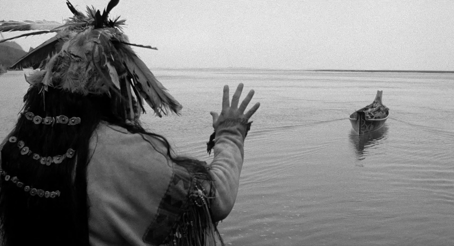 Финальным аккордом становится сцена тщательно срежиссированного ритуала — символического жертвоприношения. Никто, выполняя свою миссию проводника в загробный мир — Харона56, облекает Блейка в индейскую погребальную одежду и укладывает его в каноэ, отправляя его в последний путь. Принятие Блейком этой одежды и положения в каноэ является решающим невербальным актом, завершающим его переход к субъектности. Это демонстрирует не просто покорность, но уважение и полное понимание ритуальной системы, которую он ранее отвергал. Этот акт символизирует окончательную интернализацию роли жертвы как субъекта, добровольно участвующего в церемонии.