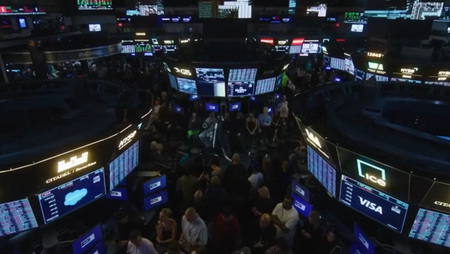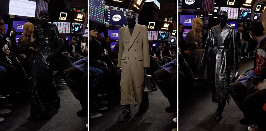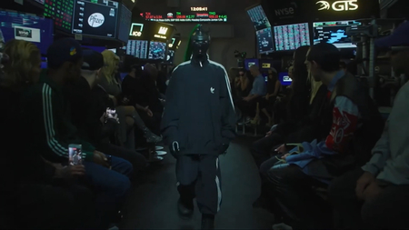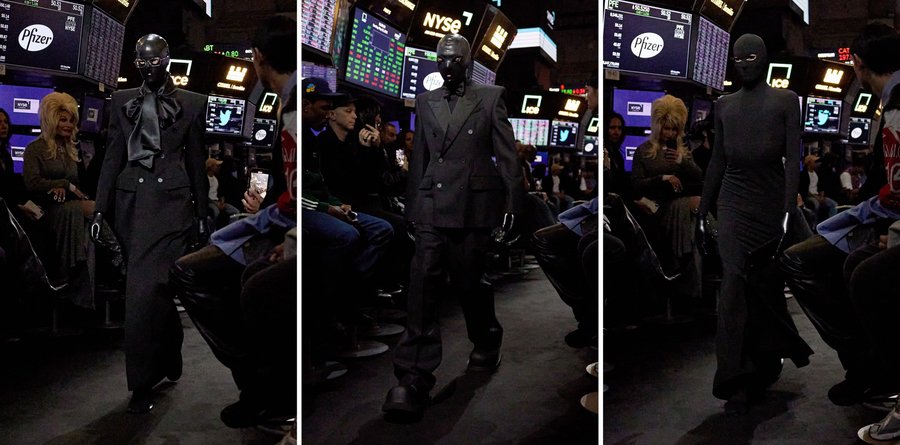 Торговый зал Нью-Йоркской фондовой биржи служит подиумом для моделей, чьи личные качества скрыты за фетиш-боди. Поверх этого латексного слоя они носят одежду из коллекции
