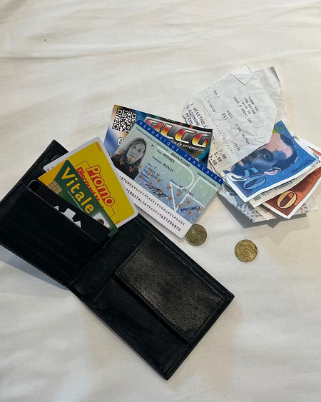 Приглашение на показ коллекции весна/лето 2023 от бренда представляет собой потертый кожаный кошелек, наполненный мешаниной из бейджей, чеков и кредитных карт с, казалось бы, случайным женским именем: Наталия Антунес.