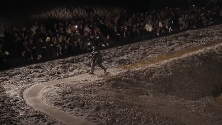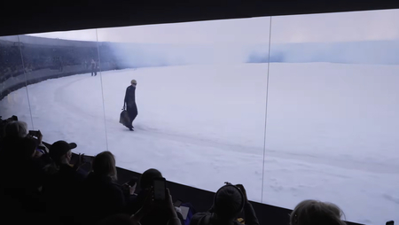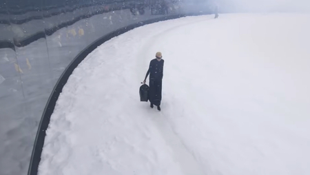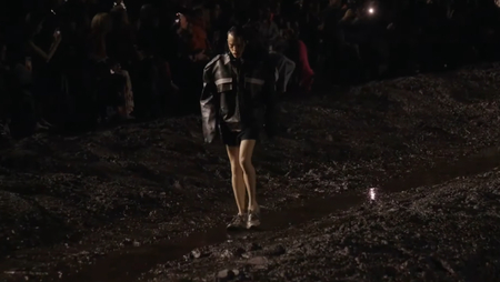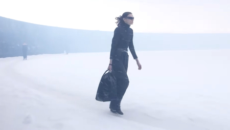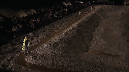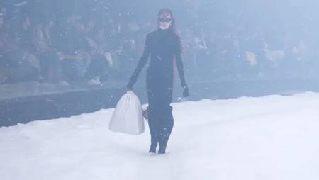 Через пирглашение в виде сломанного айфона, мусорные пакеты в руках моделей и зимний пейзаж, воссозданный на шоу, поднимаетмя тема перепотребления м его последствий (глобального потепления).