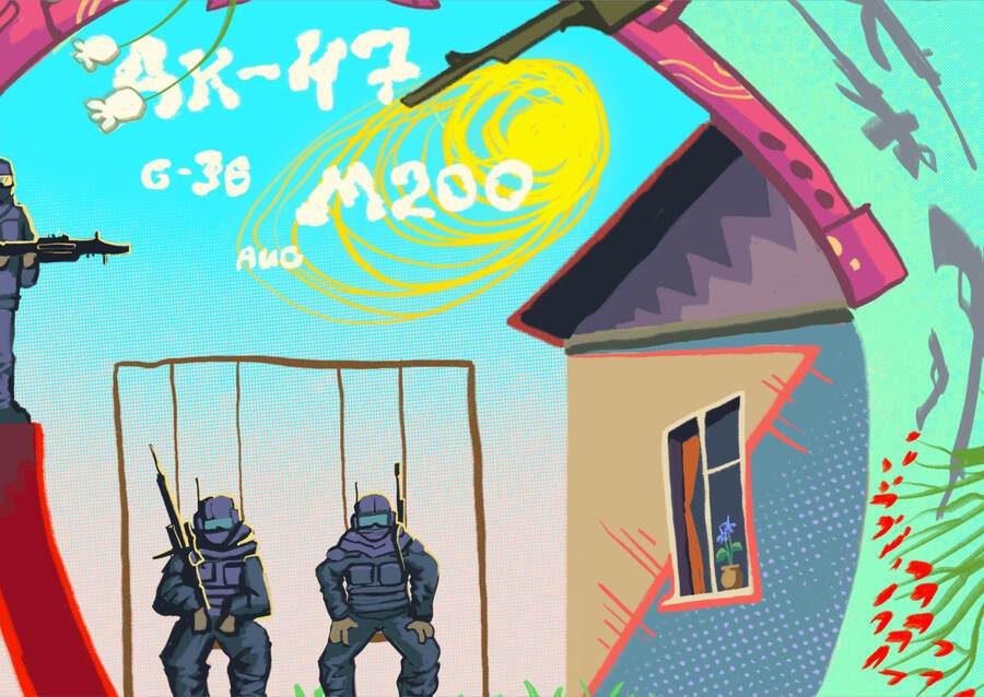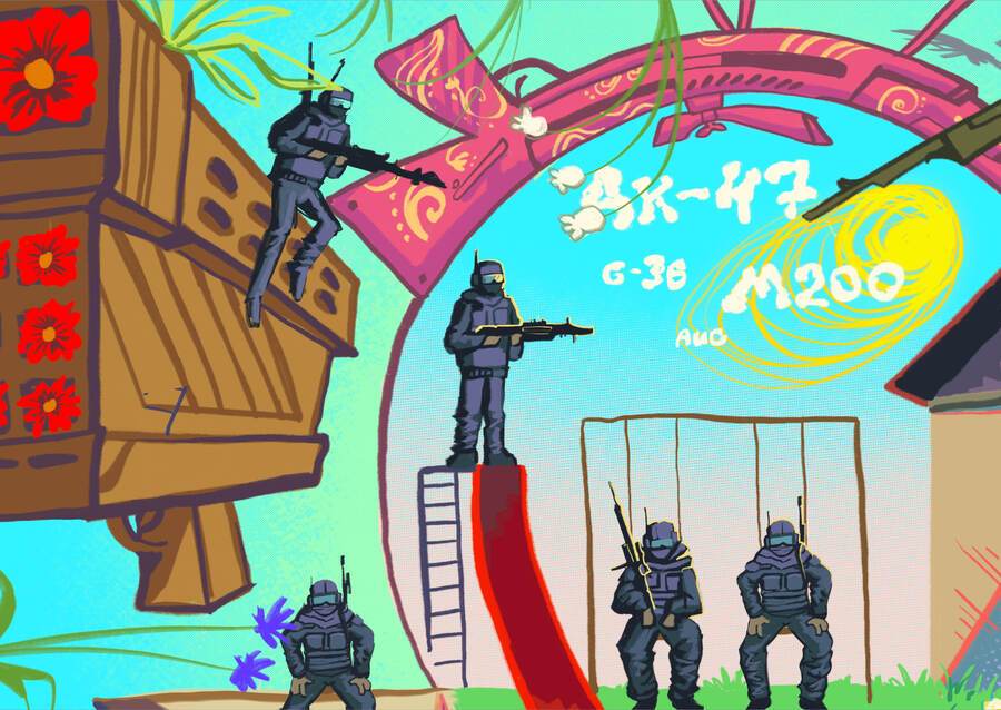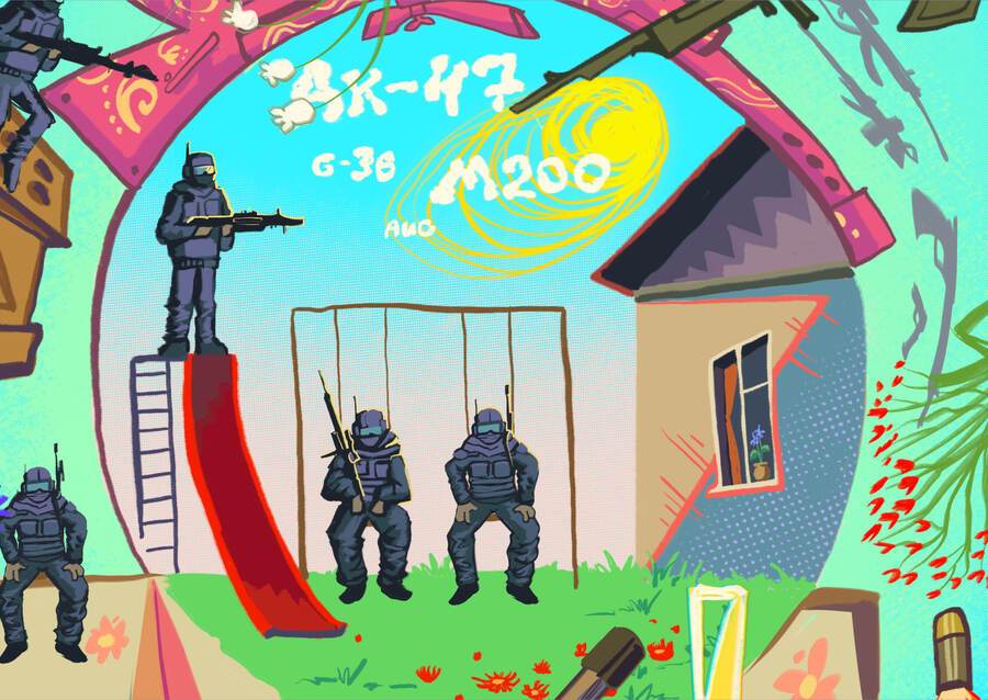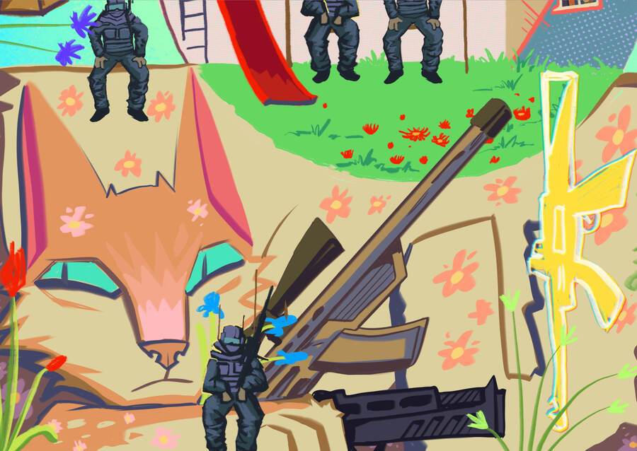 Детское и взрослое, мирное и военное. Контраст темных солдат и ярких трав и цветов. Милый спящий кот разлегся на холсте, но в лапах его оружие. Круг в центре как окно во двор и детский рисунок.Это рефлексия детских игр и ребяческих мечт о защите.
