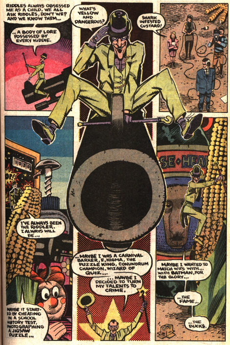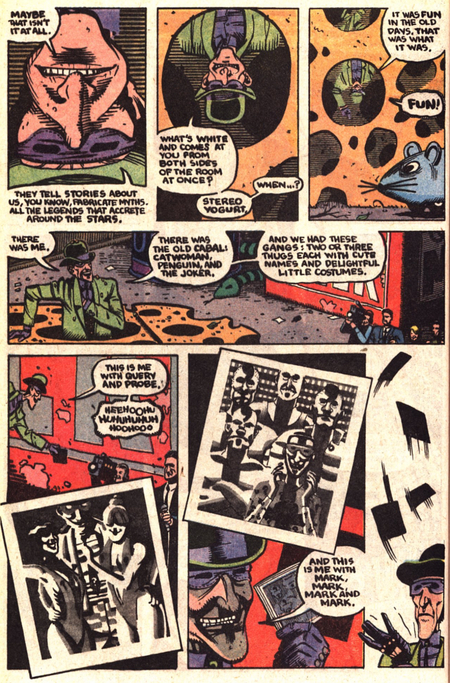 В этом комиксе есть особенно яркий пример, где рисунок фотографии Риддлера с его приспешниками противопоставлен самому Риддлеру (стр. 4 в оригинальном комиксе). И снова мы видим, что рисунок фотографии Риддлера выполнен гораздо более реалистично, чем рисунок самого Риддлера — в частности, анатомия лица персонажа на фотографии гораздо менее преувеличена (и, в отличие от изображений Риддлера, правильно расположенных в границах панели, рисунок фотографии хотя бы в малой степени соответствует реальной анатомии человеческого лица). Это еще один случай, когда рисунок фотографии в комиксе выполнен в более реалистичном стиле, чем иллюстрации в остальной части комикса.