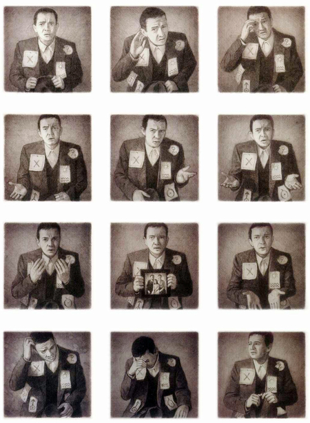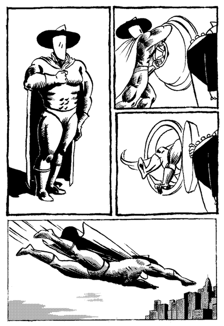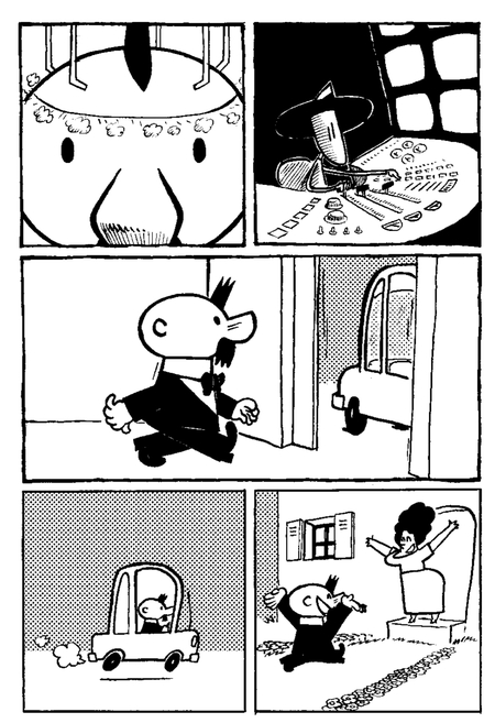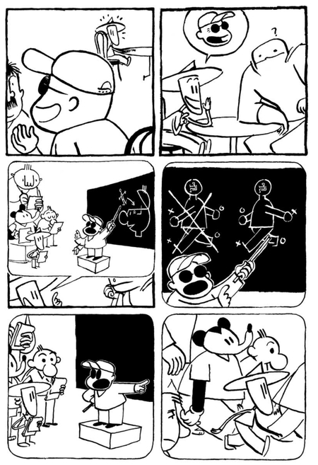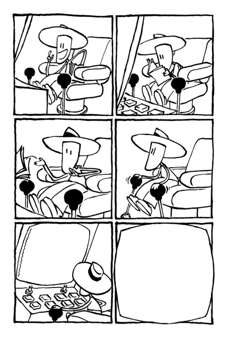 Черно-белые фотографии карикатуриста добавляют еще один изобразительный стиль, а внутренний мир, в который попадает маленький человек, наиболее «реалистичен», представлен цветными фотографиями на глянцевой бумаге, которые также не используют сетку панелей. Он пытается похитить женщину, читающую комикс, из которого он сбежал, и фотографические изображения здесь подразумевают, что маленький человек в шляпе вырвался из своего регламентированного существования в «реальный» мир. Последнее изображение показывает его нарисованную черно-белую фигуру на фотографии пляжа, рядом с женщиной, которой он пытался управлять. Рядом с ним находится назначенный женщиной оператор — цветной мультяшный персонаж. В этом комиксе фотографии не работают как референс или для установления отношений, но функционируют как репрезентативный режим, указывающий на другие возможные или параллельные миры среди многих.