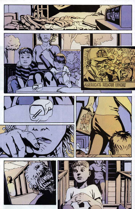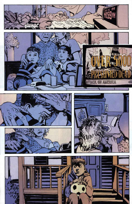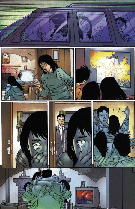 В «Periphery» ненавязчивые семейные портреты, включенные в обстановку на первой и последней странице рассказа — один на дверце холодильника, другой на телевизоре, — сопровождают семью, проходящую путь от ежедневных препирательств до паники и крайнего облегчения, поскольку на последних трех панелях выясняется, что муж не вышел вовремя на работу и, как следствие, не был в башнях-близнецах, когда на них упали самолеты. На первой панели «Periphery» объятия семьи, воссоединившейся вопреки всем ожиданиям, контрастируют с экраном телевизора, на котором все еще видно изображение горящих башен. Телевизор дополняет фотография той же семьи в рамке. Эта фотография — отголосок фотографии кухонной двери на первой странице — показывает, что, несмотря на споры, эта семья определяется своей идентичностью как семья.