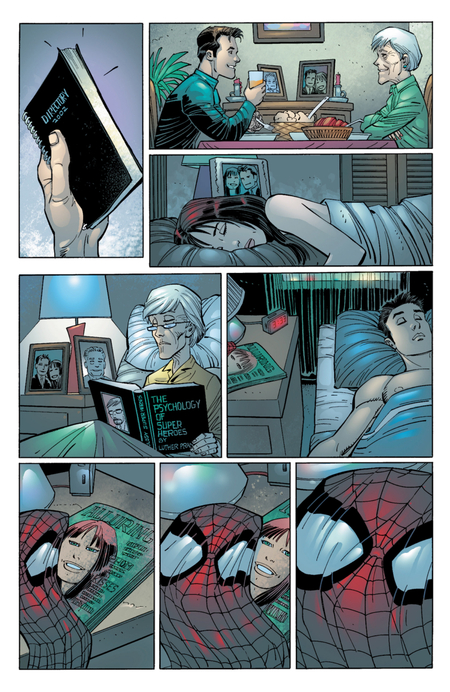 Тем временем у кровати Мэри Джейн тоже есть фотография в рамке, на которой изображены она и Питер, а на прикроватной тумбочке Питера лежит журнал с фотографией Мэри Джейн на обложке. Эти повторяющиеся портреты показывают связи, существующие между этими тремя людьми: потерю дяди Бена по-прежнему остро чувствуют и его жена, и его племянник, даже когда Питер и тетя Мэй стараются быть ближе друг к другу, и хотя они сейчас не вместе как пара, между Питером и Мэри Джейн по-прежнему существуют крепкие узы, поскольку они скучают друг по другу, но не могут протянуть руку помощи.