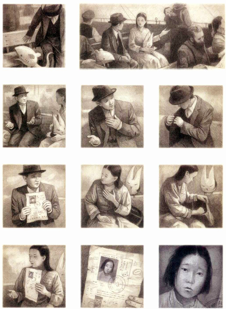 Истории нескольких других иммигрантов, с которыми подружился главный герой, рассказываются в изображениях, которые явно напоминают фотографии, благодаря их обрамлению, способу изображения границ, а также нарисованным складкам и смятым краям. Эти нарисованные фотографии не являются реальными снимками, даже в рамках диегетики, скорее это запечатленные воспоминания о зверствах на родине людей, которые теперь благополучно обосновались на новой земле.