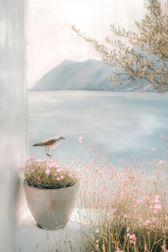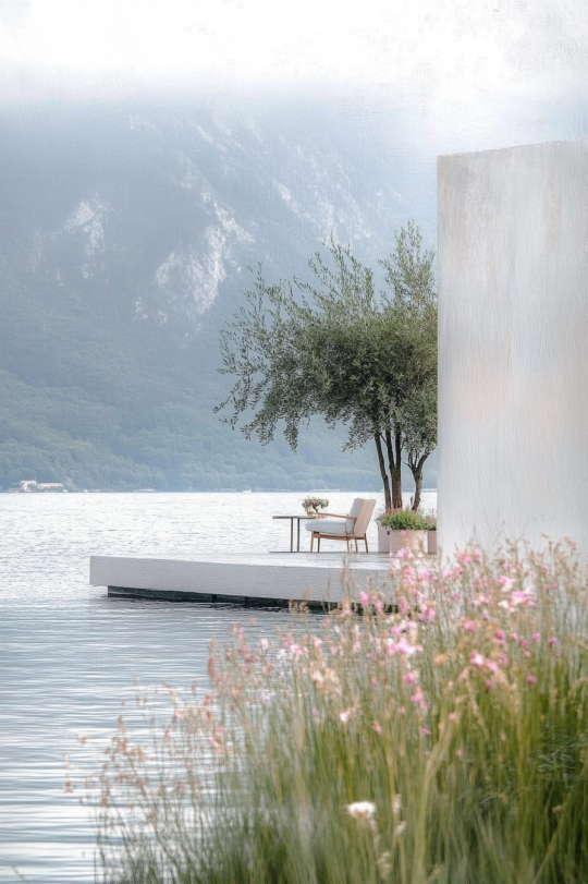 Модель: Midjourney Model V6.1 Промпт: white minimalistic house on the water, many potted flowers and a tree, a table and an armchair inside the house, mountains with plants and grass in the background --ar 16:9