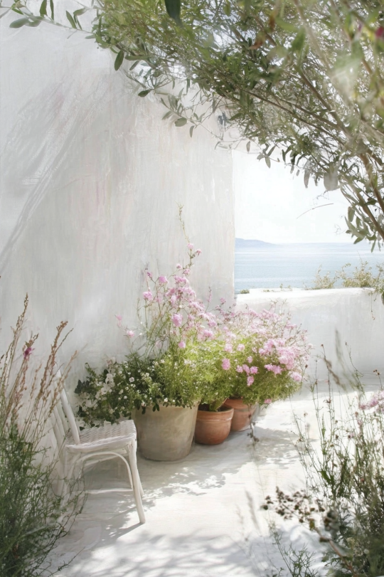 Модель: Midjourney Model V6.1 Промпт: a white minimalistic house, inside the house there are many potted flowers and a tree, a table and an armchair
