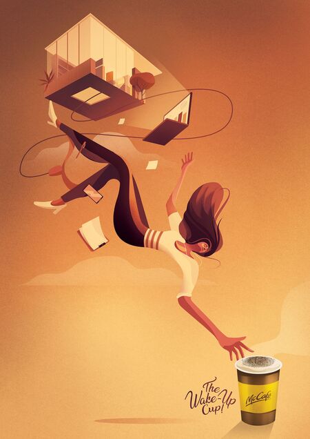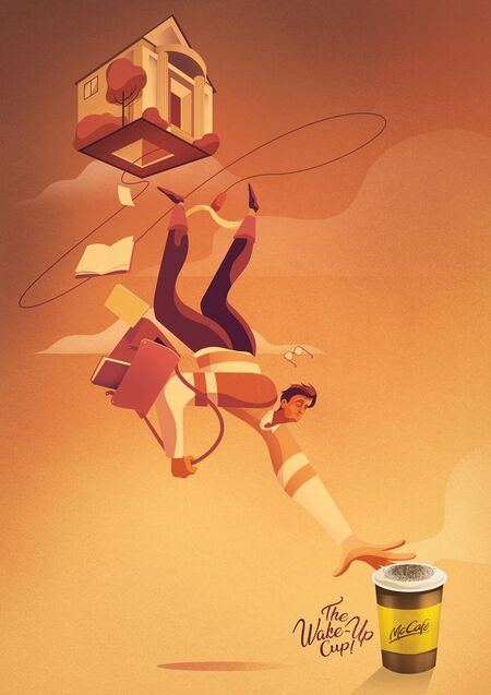 Кофе «McCafe‎» эта реклама — блестящий пример того, как простая идея, красиво проиллюстрированная, может легко привлечь внимание покупателя к своему продукту. В этой рекламе кофе от McCafe помогает «проснуться» и собраться с силами, особенно в моменты усталости или перегрузки. Визуально ощущается, что человек буквально «выпадает» из своего рабочего дня и нуждается в чем-то, что его «соберет» и вернет в нормальное состояние. Кофе в данном случае выступает как «спасение» или решение, которое помогает взбодриться и вернуться в рабочий ритм.