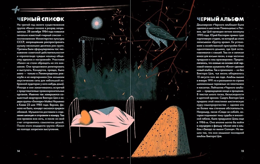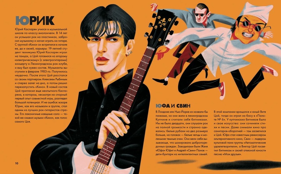 Среди динамичных форм и монументальных сцен в книге есть много места и для трогательной искренности, как, например, в развороте о Викторе Цое и его сыне. Добрый и характерный портрет героев дополняется детскими рисунками, что выглядит умилительно абсурдно и непосредственно. Отточив технику создания портрета до высокого сходства и выразительности, Маша не забывает передавать в своих иллюстрациях самое главное — живую эмоцию, которая может быть разной, но всегда честной.