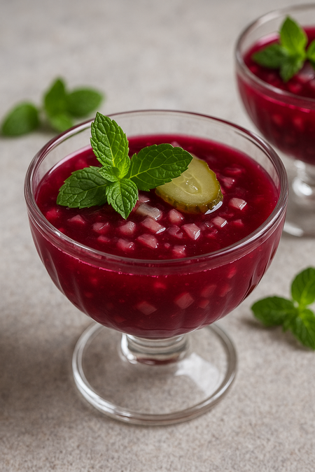 Подача: в стеклянных креманках, украсить мятой и маленьким кусочком маринованного огурца.