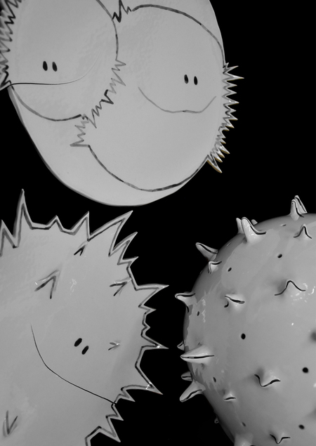 Однако во время обжигов вновь, и вновь тарелки трескались, из-за чего мы с преподавателем решили дать новую жизнь этим трещинам, взяв их за основу милой и широкой улыбки рыбы-шара.