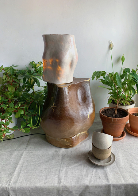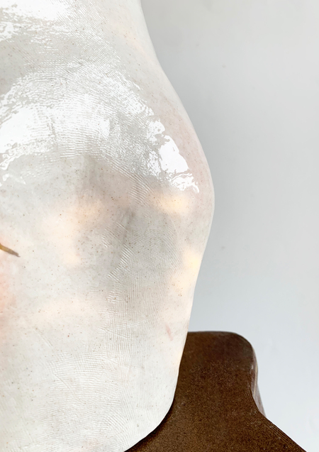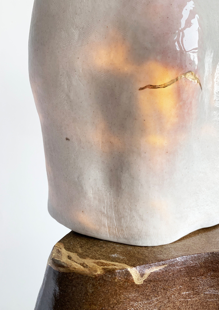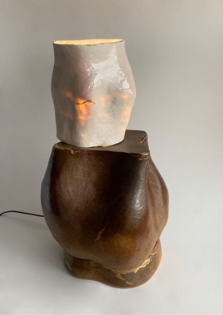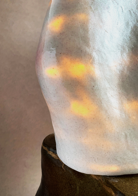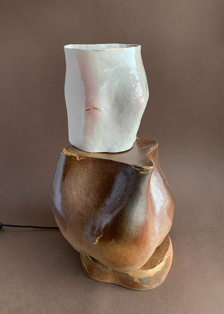 Лампа из серии керамики про тело. Эта серия про тактильность, телесность, про чувственность, про изгибы, про мягкость, про касания. Про тело — которое не меньше, чем наше сознание, наш мозг, наше мышление — является нашей основой. Это равносильная часть нас, которую надо уметь слушать, которая чувствует, которая запоминает, которая откликается.
