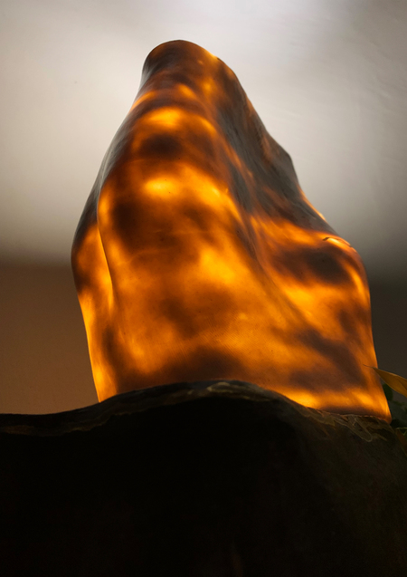 Лампа состоит из трёх керамических деталей, поставленных друг на друга. Две нижние части выполнены из смеси высокотемпературных глин, а верхняя часть (плафон) сделан из тонкого фарфора, который «светится», просвечивает яркий свет сквозь свои стенки. Без горящей лампочки светильник выглядит как сложная скульптура. А в темноте и включённом свете лампа превращается в завораживающий ночник, создающий магическую атмосферу и окутывает помещение тёплым приглушённым свечением. Фарфоровый плафон превращается в пылающее живое «сердце» лампы.