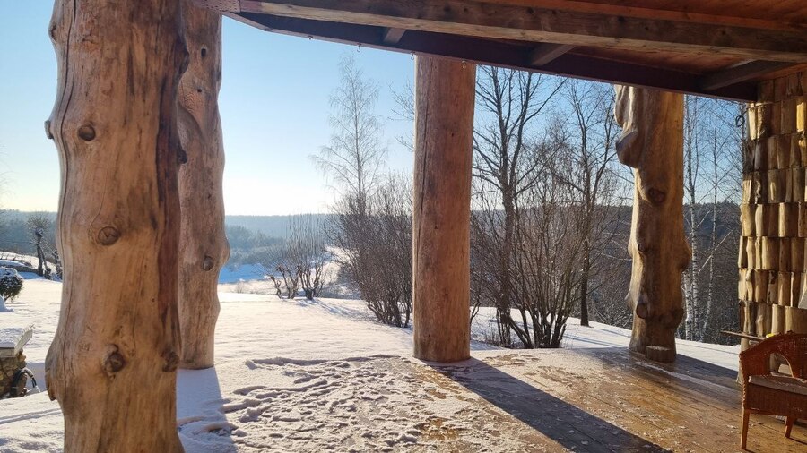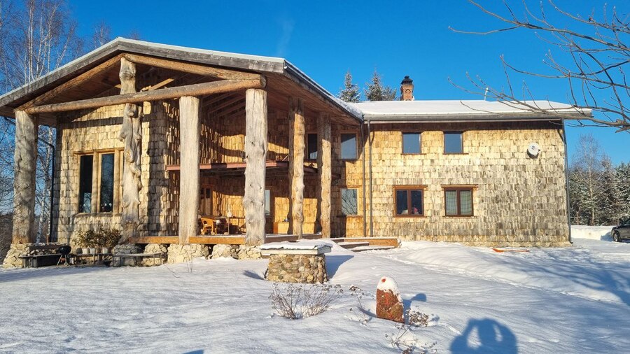 «Место требовало чего-то пафосного и одновременного не вызывающего раздражение у простого человека — все-таки вокруг деревня, а не Рублёвка. Красивый дом на холме, барское поместье — этот образ глубоко укоренен в народном сознании. Однако совсем классику в стиле Ленинских Горок делать не хотелось. Решил обойтись без декора и ограничиться простыми колоннами из окоренных стволов и пустотелым стропильным фронтоном. В качестве материала отделки выбрал сосну — ее возили из Смоленской области. Раза три перекладывали кровлю, и все из-за поиска правильной толщины колонн — поначалу они получались слишком тонкими, что мне категорически не нравилось. Чтобы не перерезать пополам портик, сделал пространство гостиной позади него двусветным, а террасу на втором этаже максимально укоротил — она есть только над входной зоной». — Николай Полисский в разговоре Юле Бычковой.