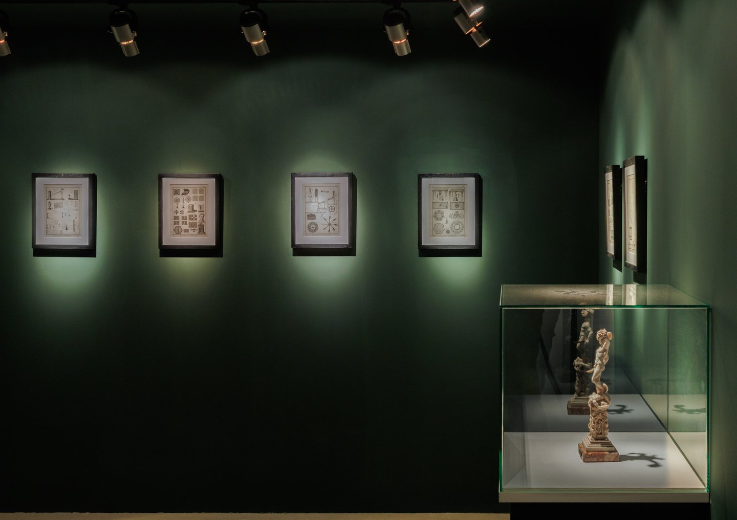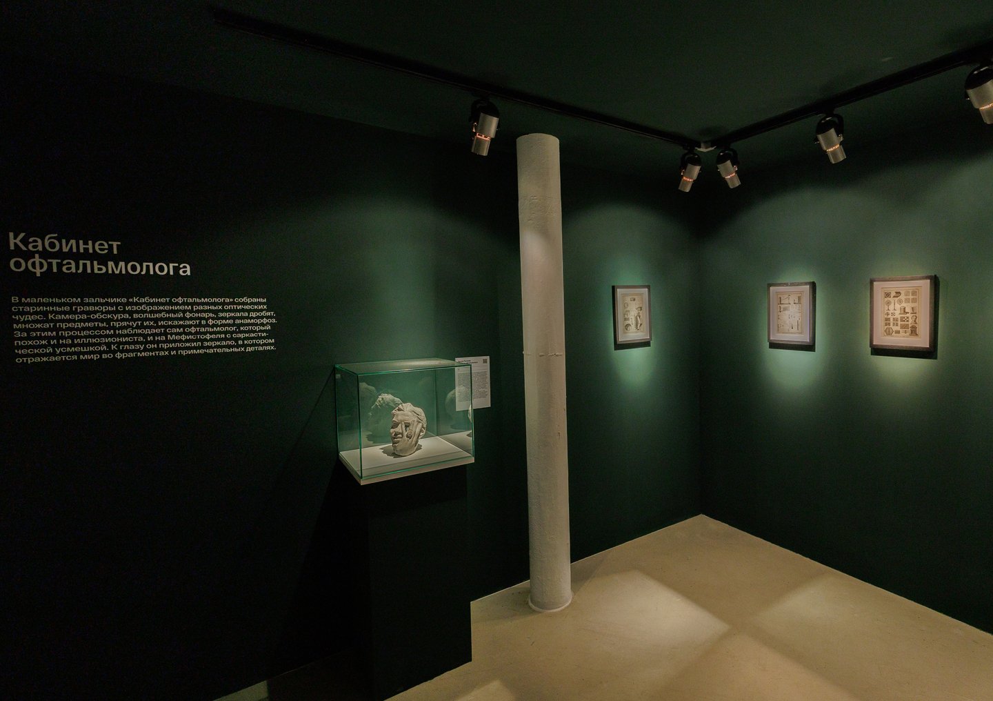 В небольшом вводном зале «Кабинет офтальмолога» представлены гравюры и скульптуры, отсылающие к зарождению интереса к вопросу взгляда, к первым оптическим открытиям и замысловатым аппаратам. Символическим спутником в дальнейшее погружение в тему зрения становится «Портрет офтальмолога» (2025) Артёма Рогачёва — скульптура, изображающая не то врача, не то иллюзиониста, не то самого Мефистофеля из «Фауста», который через приложенное к глазу увеличительное стекло наблюдает за миром во всех его мельчайших подробностях.