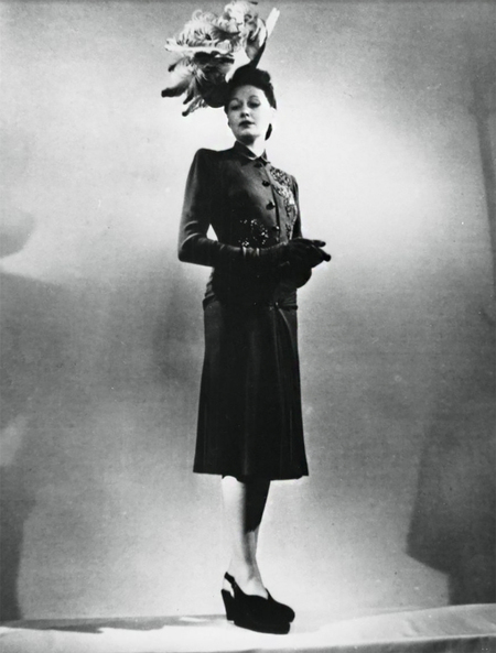 Слева: Пальто, муфта и шляпка. Nina Ricci, 1943 год Справа: Вызывающая роскошь. Jacques Fath, 1943