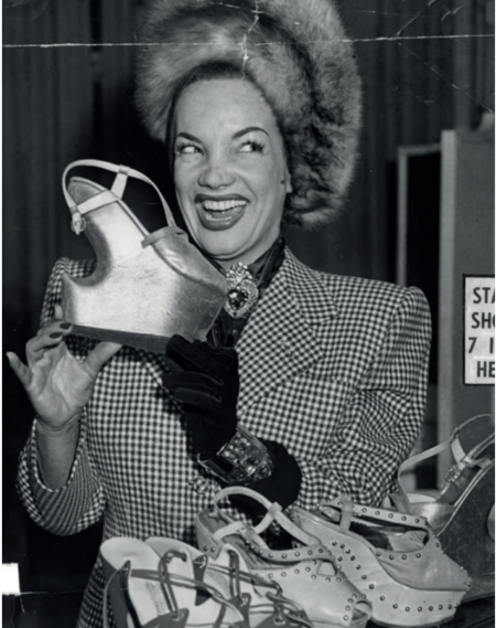 Каблук женской обуви поднимался вместе с платформой. Использовались лески или другие необычные материалы в условиях нехватки всего в то время. Пробковые или деревянные платформы.