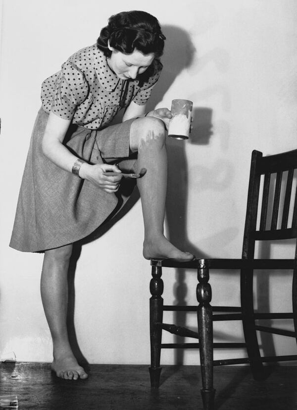 Острый недостаток в военное время был и в вопросе чулок. С голыми ногами ходить считалось неприлично, поэтому девушки выходили из положения, рисуя стрелки на ногах так, чтобы это было похоже на чулки. Избавление от волос тоже началось в это время, чтобы создать иллюзию того, что на ноги что-то надето. Так появлялись и leg make-up бары, где девушки тональными средствами рисовали друг-другу подобие чулок.
