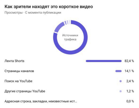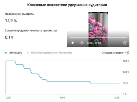 Видео набрало мало просмотров, но при этом средняя продолжительность просмотра составляет 14 секунд из 18, получается, те люди, у которых ролик появлялся в ленте шортс, практически досматривали его до конца, а значит ролик цепляет внимание и удерживает его.