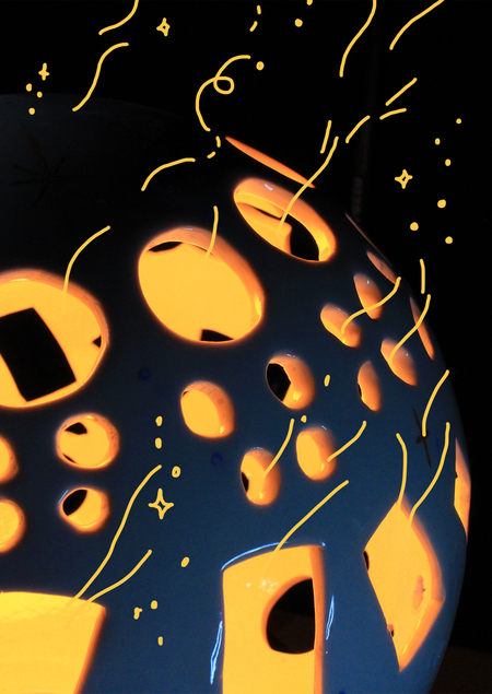 В моем проекте я хотела использовать это свойство быстрого вращения и создала два изделия на эту тему: расписную тарелку и светильник-шар. При раскручивании нам открывается скрытая суть вещи — оказывается, все рисунки и отверстия были связаны между собой.
