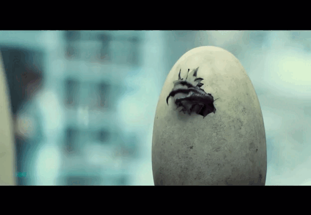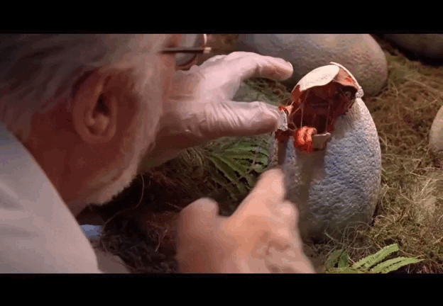 Вылупление велоцираптора 1 — «Парк Юрского периода» 1993 год (кукла) 2 — «Мир Юрского периода» 2015 год (CGI)