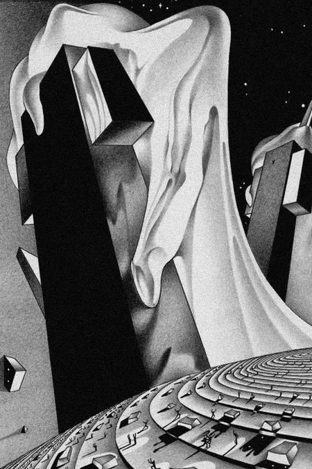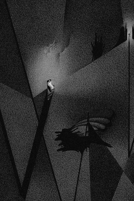Большая часть иллюстраций Нади Рушевой –– это эмоциональные лица героев. Фоменко выстраивает свои рисунки через рациональное мышление. Он передает то, как эти эмоции выглядят в пространстве, математически.