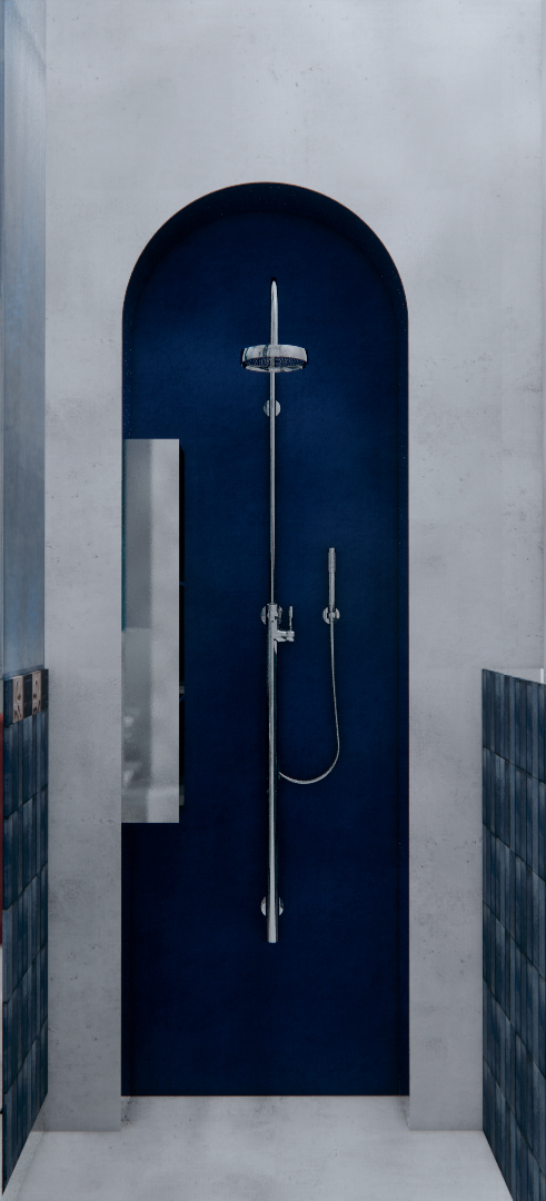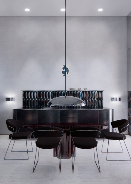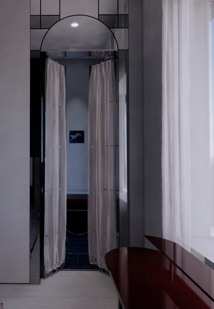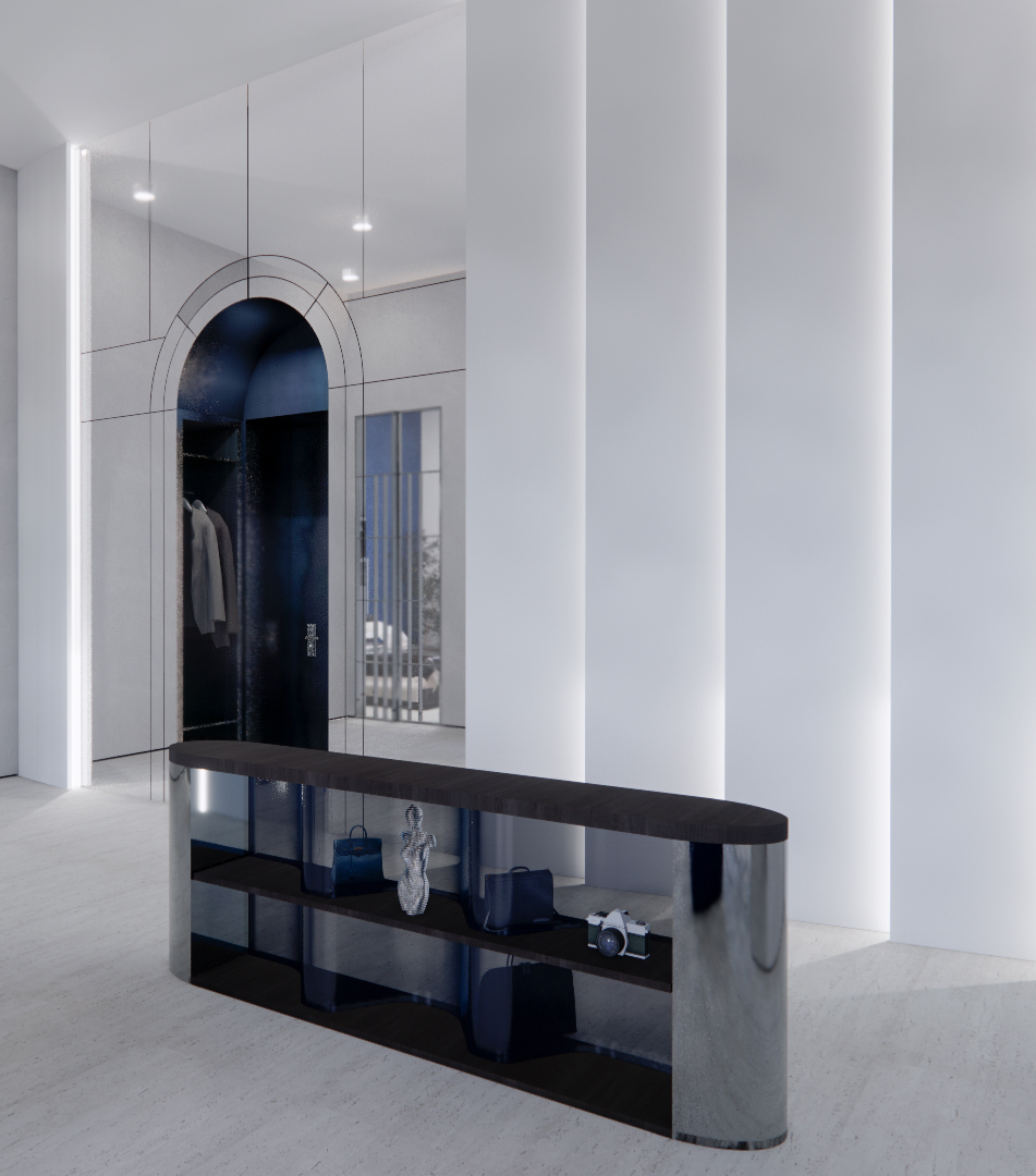 Сердце пространства, которое зонируется предметами интерьера. Зеркальность, обтекаемая геометрия, арочные своды закольцовывают визуальный ритм.